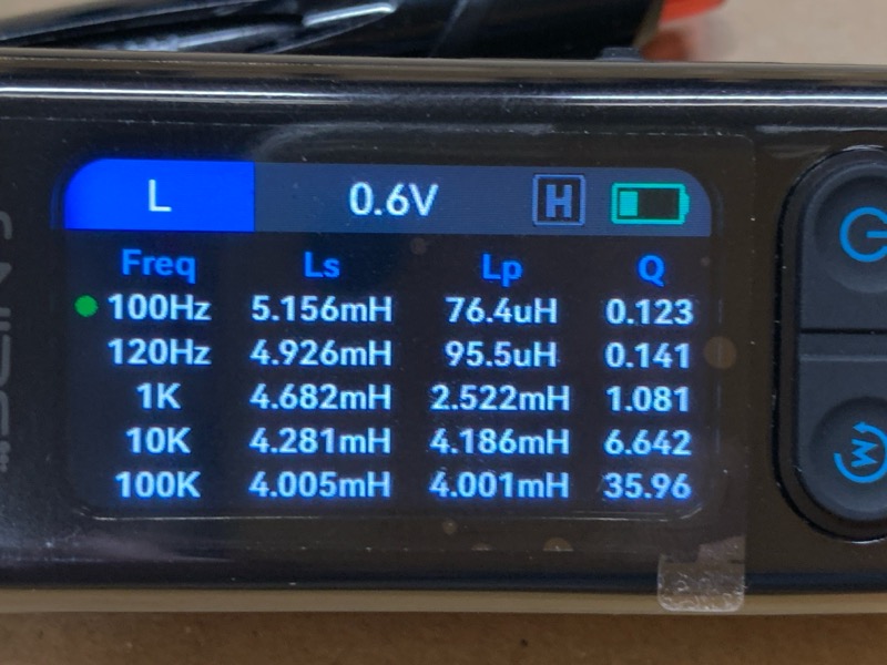 Lでも周波数ごとの測定をやってみた。100kHzまでしか測定できないのでほぼ低周波用と言うことになるが、ないよりは遥かにありがたい。
