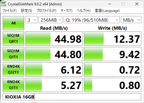 興味本位でCrystalDiskMarkでベンチマークテストしてみた。これがその結果。