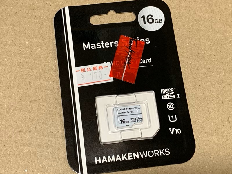 そこで目をつけたのが浜田電機オリジナルブランドHAMAKEN WORKSのmicroSDカード。秋葉原の浜田電機の店舗で16GBの物を購入した。