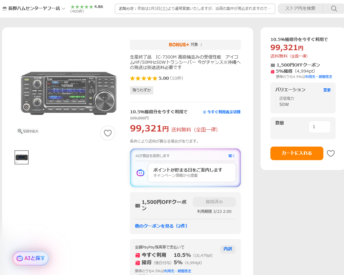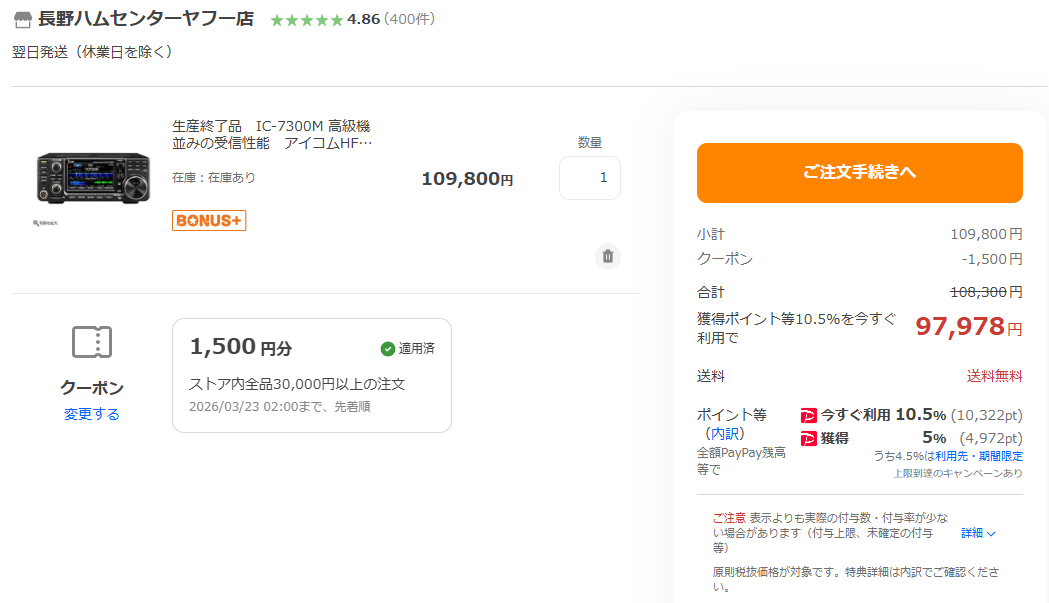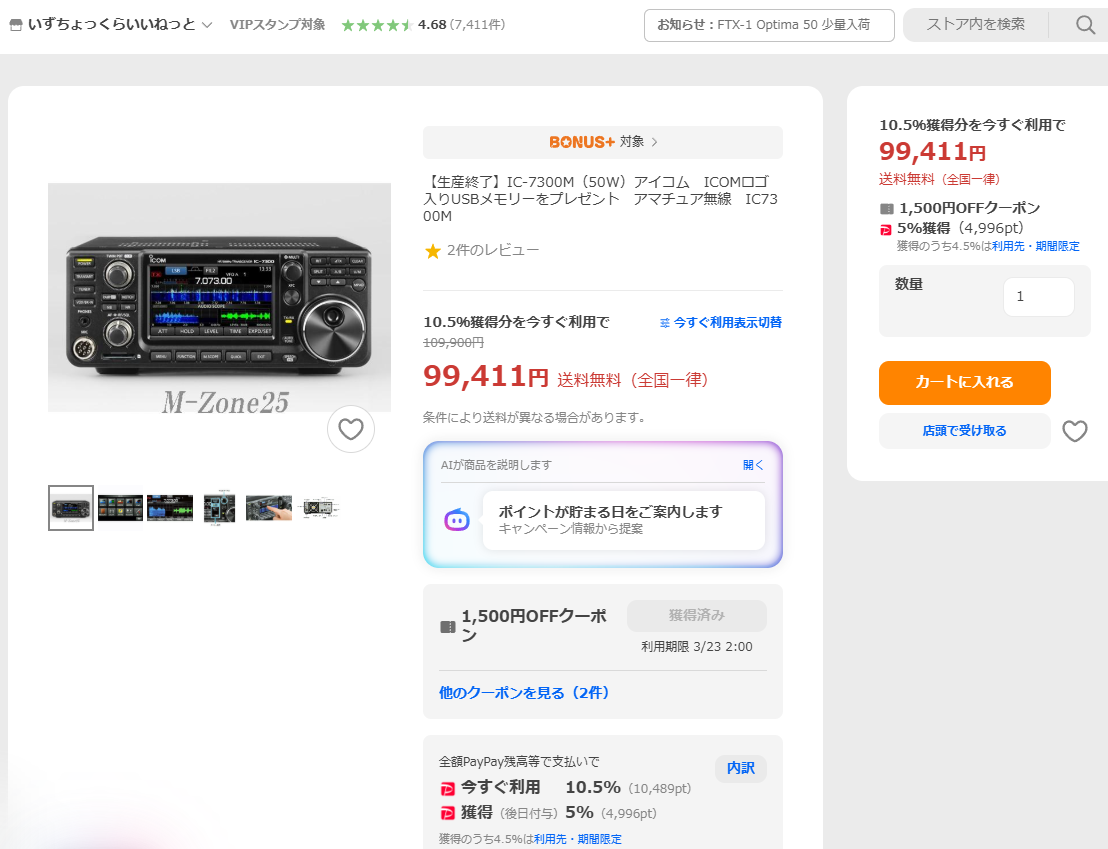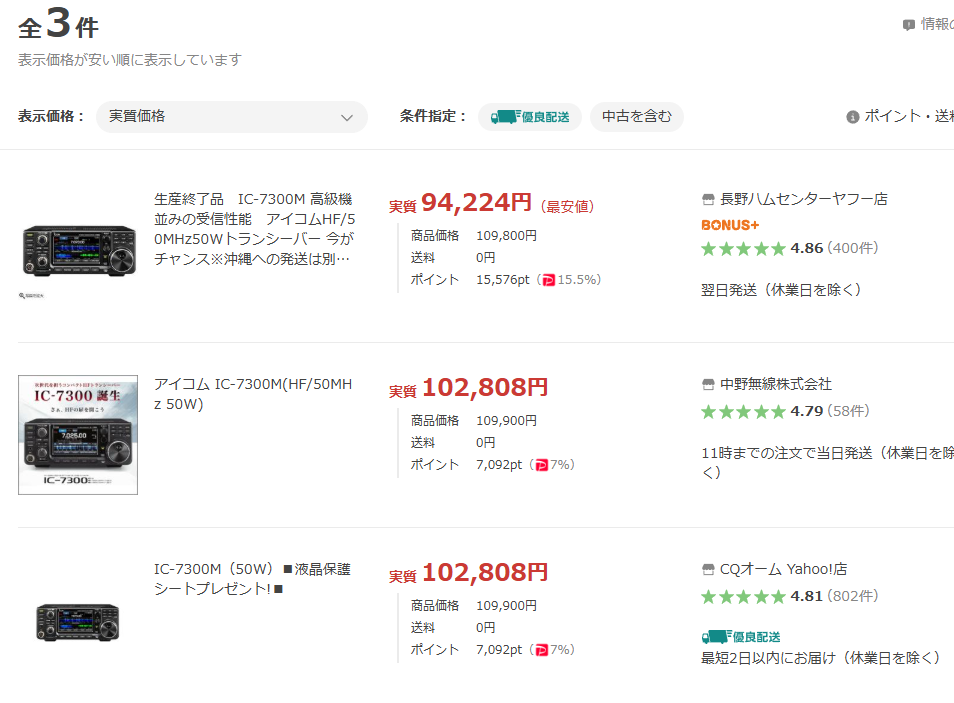 「長野ハムセンターヤフー店」のIC-7300Mの販売ページのリンクはこちら。