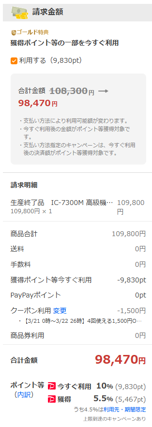 支払額が98,470円で、獲得ポイントが5,467。差し引きの実質額は、93,003円。前回は94,083円だったので、1,080円の値下がり。前回もクーポンがあったけれど、前回は1,000円。今回は1,500円のクーポン。そのクーポンの差額とポイント還元が多いので、そこそこ下がったという感じ。