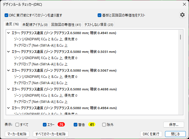 試しにいじってみたら基板エディタのDRCで大量のクリアランス違反が発生した。