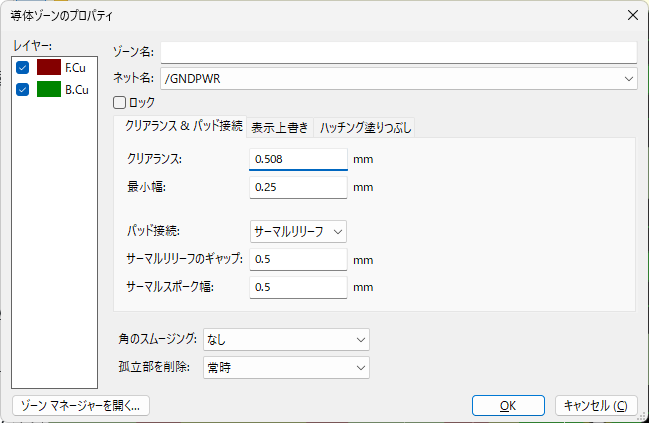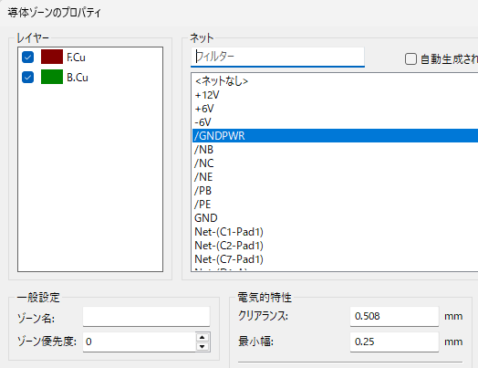 ゾーンクリアランス絡みのエラーなので、まずはKiCad 9.0.7でのゾーンのクリアランスの設定を確認したら、0.508mmになっている。