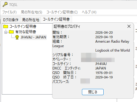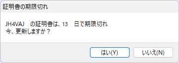 TQSLを立ち上げたら、証明書の有効期限が切れる旨のメッセージが表示された。