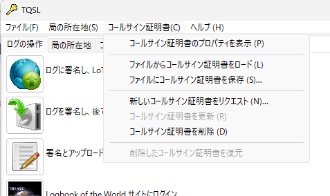 次は、その証明書をTQSLに読み込む。証明書をファイルに保存してダブルクリックすればTQSLが起動して読み込んでくれる ← これは前回やった。今回はTQSLを立ち上げていたので、そこからメニューを辿って読み込んでみた。