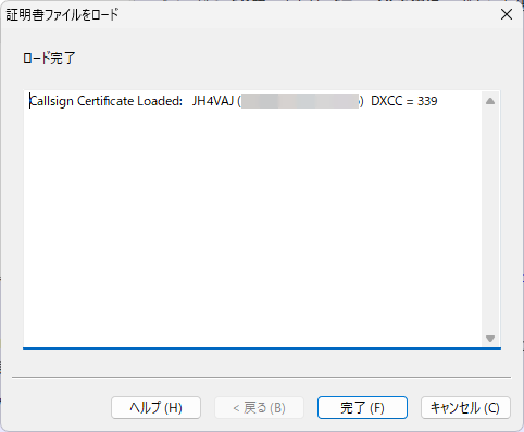 「ファイルからコールサイン証明書をロード」を選び、証明書ファイルを指定すればOK。