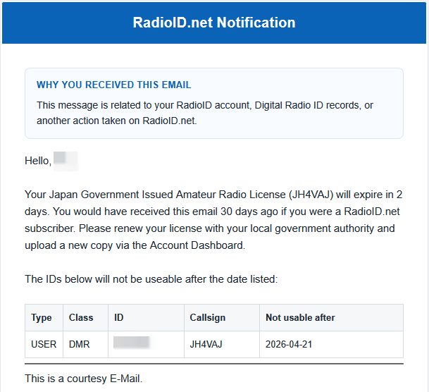 無線局免許の有効期限が迫った二日ほど前にRadioID.netからこんなメールが届いた。