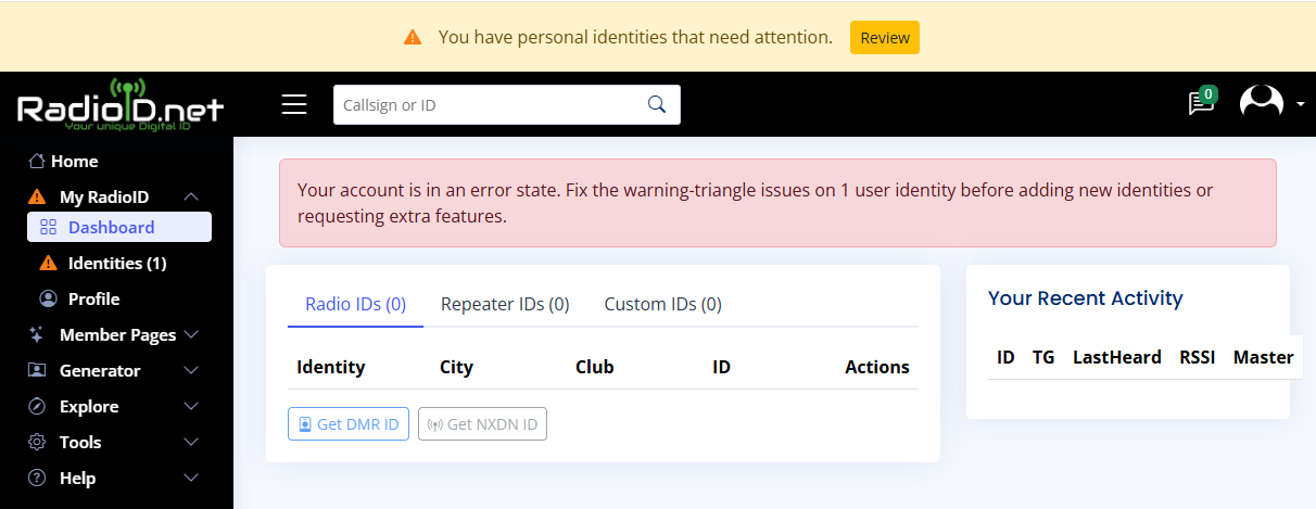 RadioID.netにログインするとエラー状態。