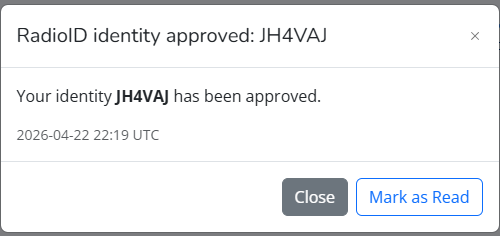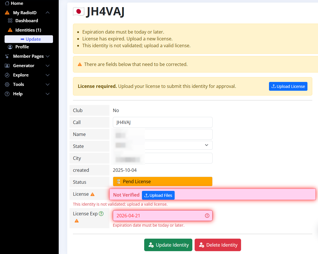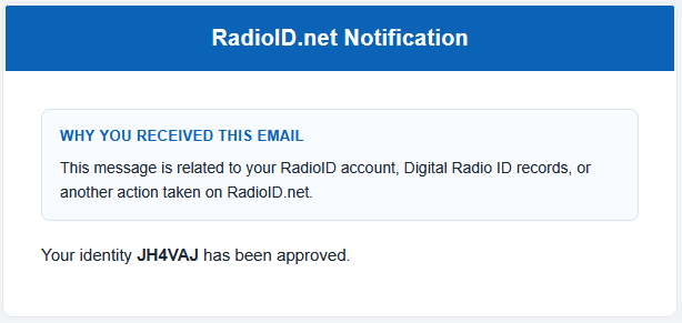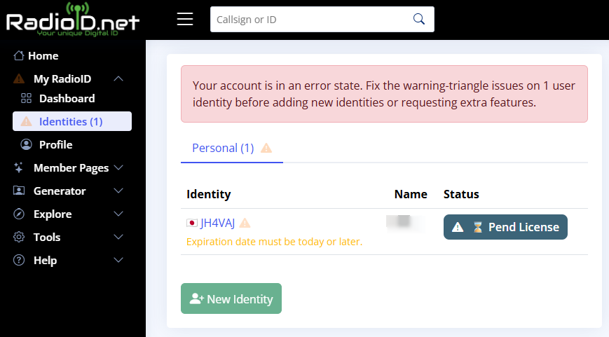それはそれとして、新しい無線局免許(の写し)が手に入るようになったので、RadioID.netで復活の手続きをやってみる。