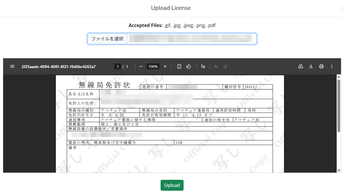 ダウンロードした無線局免許のファイルをアップロードする。