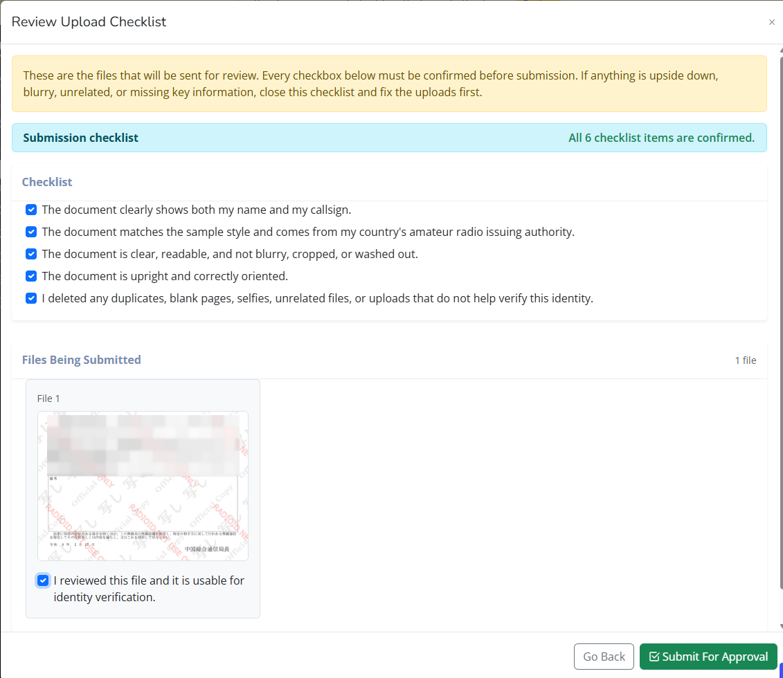 チェックリストの内容を確認してそれぞれチェック。最後に右下のSubmit For Approval。