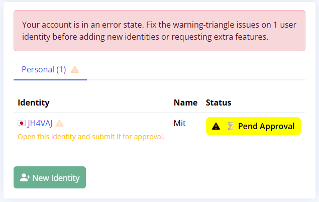オレンジ三角の警告アイコンが付いているIdentiesを見ににいくと免許が保留状態。