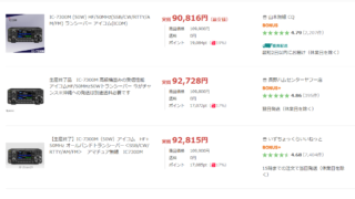 通販 【定点観測】IC-7300M、本日のお値段(90,869円) 今回は「プレミアムな日曜日」ではなくて、特別なセールもやっていないみたい。では、今回の最安値の検索結果。今回も山本無線CQが最安値。カートに入れて進める。支払額が104,899円で、獲得ポイントが14,030。差し引きの実質額は、90,86... 2025/12/21 通販