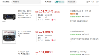 通販 【定点観測】IC-7300M、本日のお値段(1̵0̵0̵,̵8̵4̵4̵ 94,083円) 今回も普通に「プレミアムな日曜日」。早速、今回の最安値の検索結果。今回も3件。最安値ショップは変わらず、長野ハムセンターヤフー店。カートに入れて進める。支払額が102,860円で、獲得ポイントが2,016。差し引きの実質額は、100,844... 2026/03/15 通販