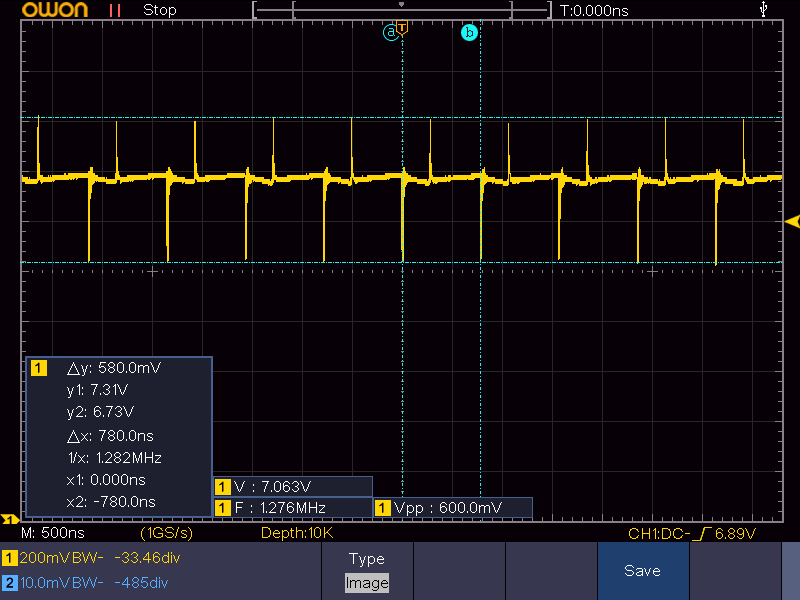 これで7Vに昇圧すれば良さそうですが、ノイズがかなりすごいです。下は、7Vに設定して140mA程度流してときの電圧波形(負荷は51Ωの抵抗)。600mVpp位のスパイク状のノイズが乗っています(周期は1.3MHz弱)。