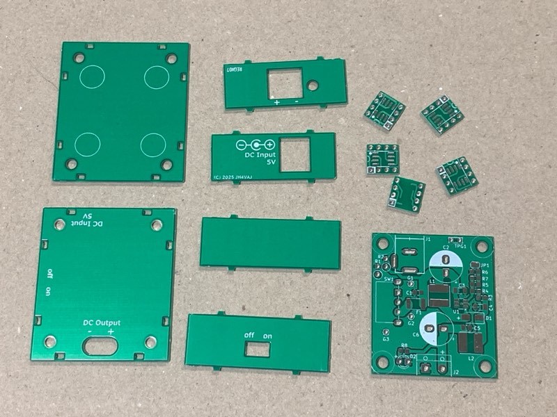 昇圧チップは、先の激安アダプタと同じMT3608を使います。基本的にはデータシート上の回路と同じ。その後段にLC LPFを付けてノイズを抑制します。