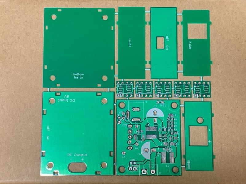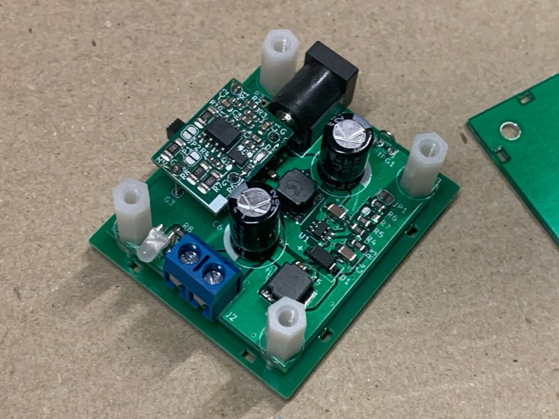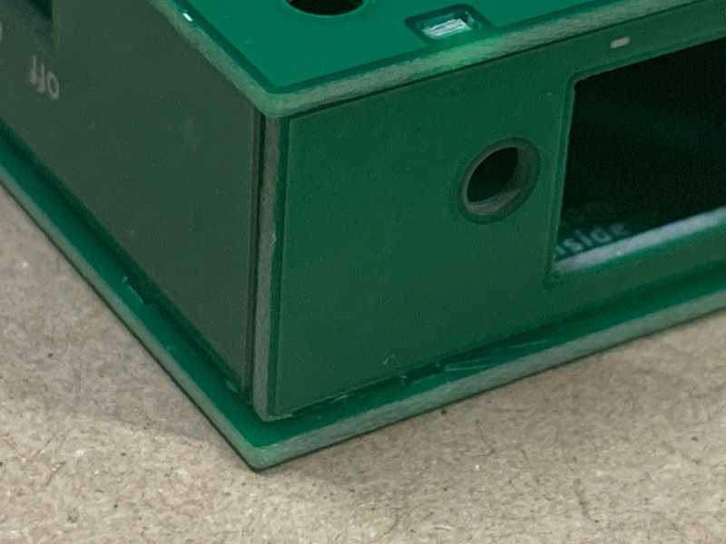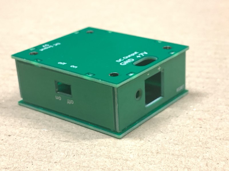 スクリューターミナル、スライドスイッチ、DCジャックの足を短く切ってください。切らないと底板に当たって閉まりません(スペーサの高さは2mmです)。
