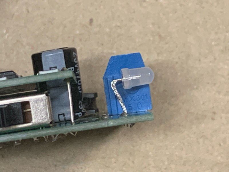 LEDは極性に注意してください。下の写真のように90度曲げて取り付けます。参考として寸法を入れておきますが、取り付けたあとで多少は調整できますので、シビアに考えすぎなくて大丈夫です。