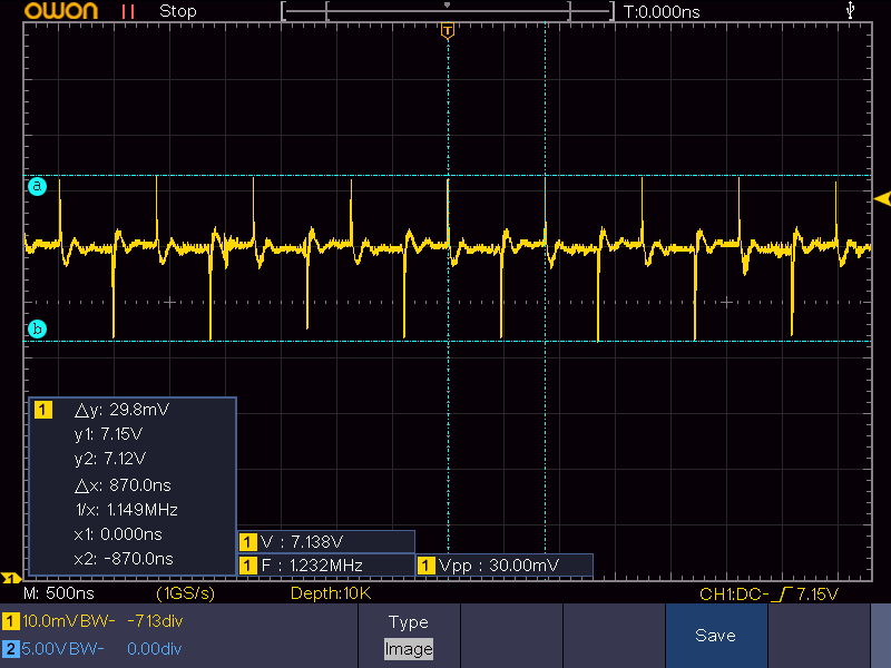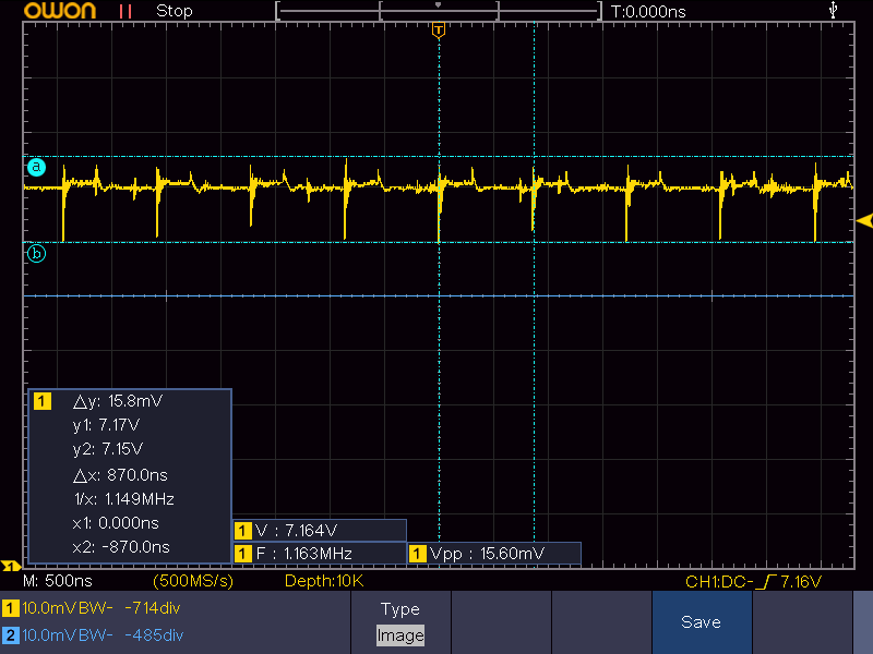 先程同じ、7V出力で51Ωを負荷とした場合(約140mA)の電圧波形はこれです。ノイズは16mVpp程度です。ノイズの周期は先程のものよりも少し低い1.15MHz程度ですが、これはロット差や個体差でしょう(仕様上の標準値は1.2MHz)。