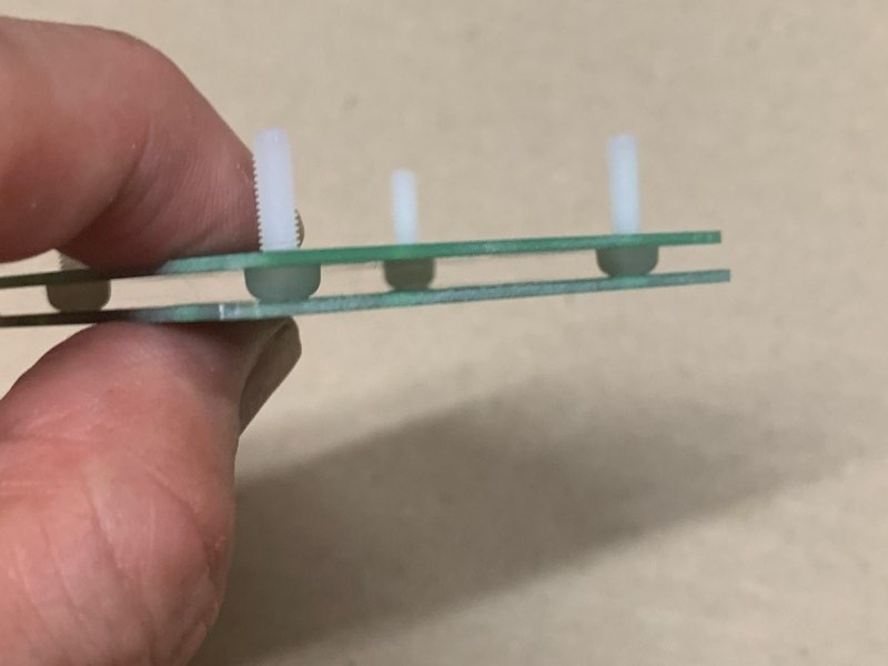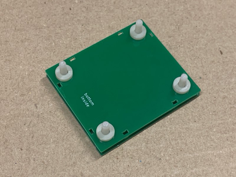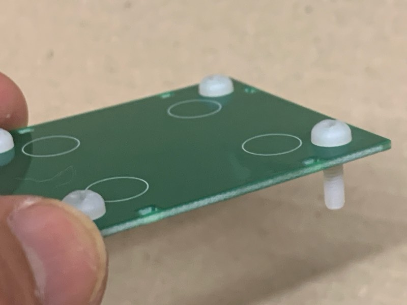 部品を実装した基板を乗せます。底板には前後の区別はありませんので気にしなくて大丈夫です。基板を載せたら、スタンドオフを締めます。スタンドオフが外れない程度に軽く締めるだけでOKです。
