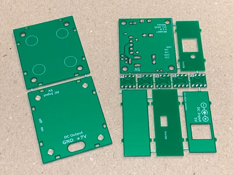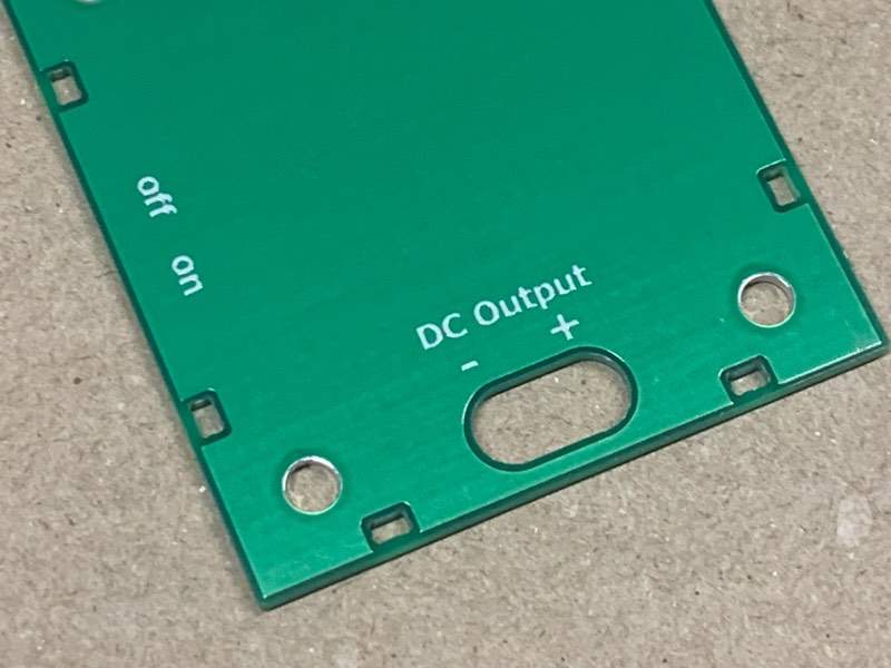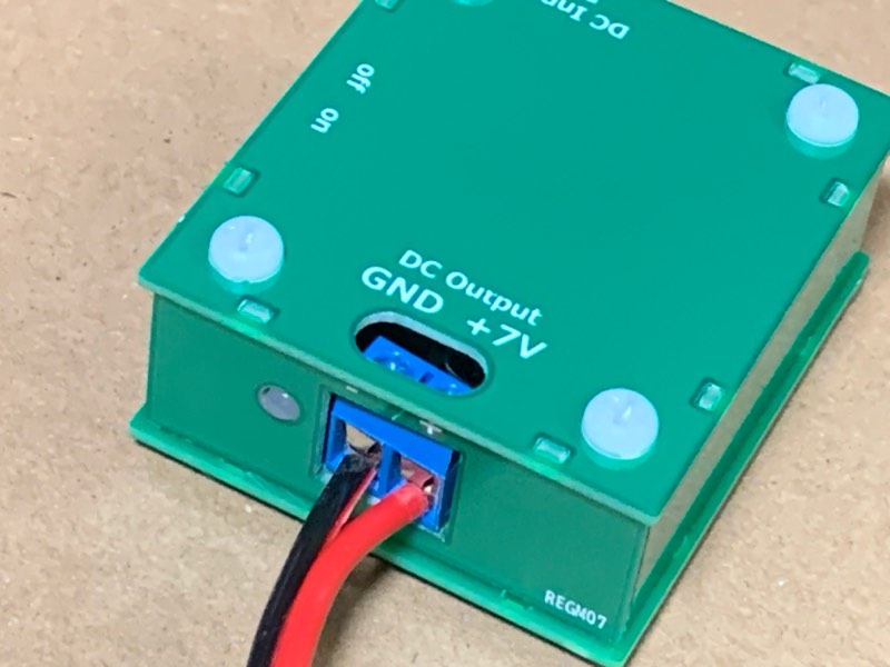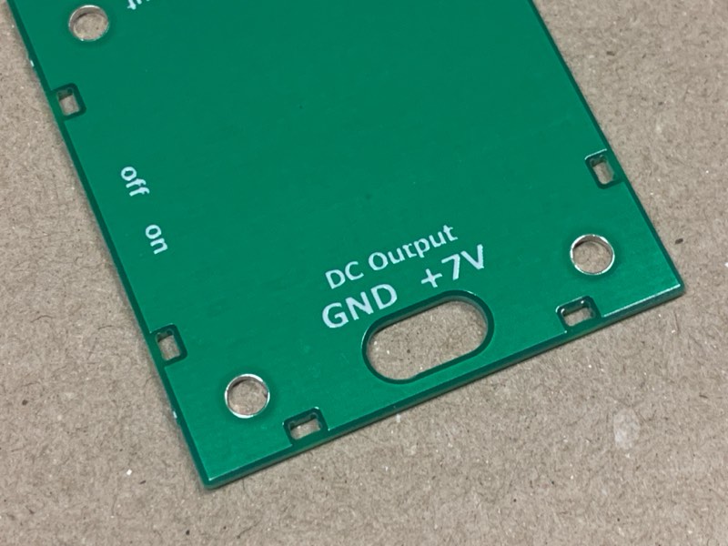 天板はリバーシブルです。片側には出力に「+7V」と記載しています。もう一方には「+」だけを記載しています。7V以外に設定した場合は、「+」の方をお使いいただければと思います。