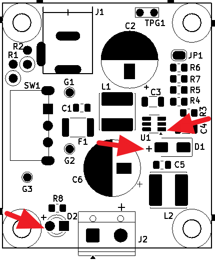 500mAくらい流すと、昇圧チップとインダクタがかなり発熱します。大きめの電流で使う場合には、様子を見ながら使用してください。