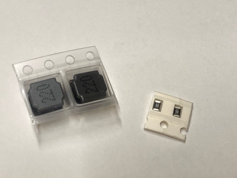 続いて、インダクタと抵抗。インダクタは大きいのですぐに分かるでしょう。抵抗は値が印字されています。4桁表示ですので、例えば、2200が200Ω、1002が10kΩです。