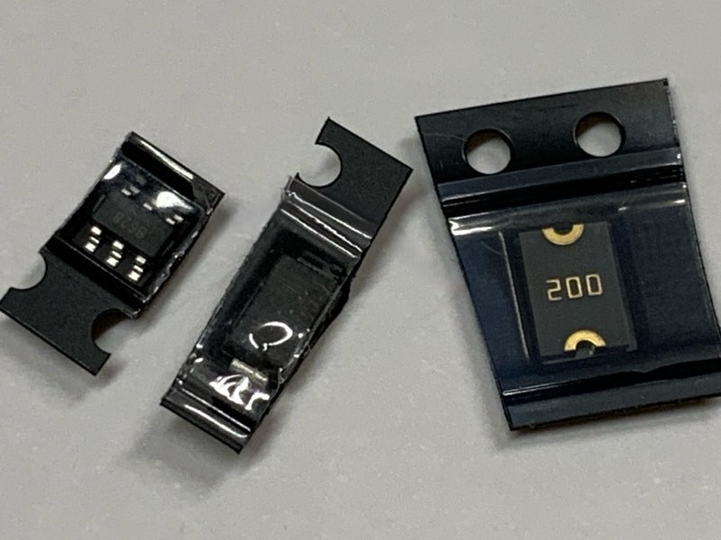 最後に黒いパッケージ。足が6本あるのがIC(左)、ダイオード(中央)、ポリフューズ(右)です。