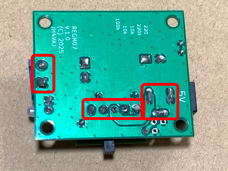 このモジュールを取り付ける場合は、まず、G1、G2、G3、それにR1(スイッチ寄りのランド)にスズメッキ線(コンデンサの足の切れ端でOK)を立てます。この取り付け方の写真は別機種(REGM05)のものです。本機もモジュールの取り付け方は同じです(写真を撮りそこねました。ご了承ください)。
